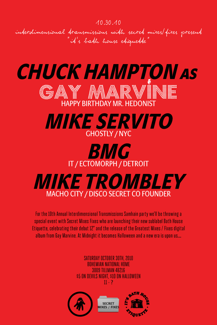 For the 10th Annual Interdimensional Transmissions Samhain party we'll be throwing a special event with Secret Mixes Fixes who are launching their new sublabel Bath House Etiquette, celebrating their debut 12" and the release of the Greatest Mixes Fixes digital album from Gay Marvine. At Midnight it becomes Halloween and a new era is upon us…